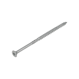 De platte kop constructieschroef verzinkt netjes in het houtoppervlak, wat zorgt voor een vlak en strak eindresultaat.