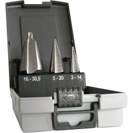 Hoogwaardige conische borenset van het merk Heller (made in Germany). Voor het boren van conische gaten in materialen zoals aluminium, non-ferro metaal, PVC, diverse plaatwerk en RVS, met geïntegreerde centreerboor met scherpe boorpunt, snijkanten conisch toenemend met 20-30 °, diameter schaalverdeling gestempeld op de boorkop, met 3 conische boren voor gaten 3-14mm, 8-20mm en 16-30.5mm, levering in plastic doos