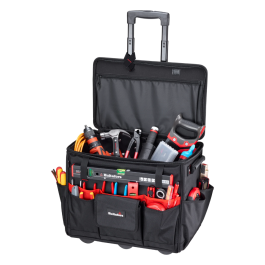 Voor meer grip tijdens het verplaatsen op diverse ondergronden beschikken de wielen over profiel. In combinatie met het telescopische handvat was het verplaatsen van een trolley nooit eerder zo eenvoudig. De tas bestaat uit één groot vak welke is voorzien van kleinere vakken en gereedschapshouders. De bodem is rood gestoffeerd waardoor je beter kunt zien wat er in zit. Het hoofdvak met ritssluiting heeft een plat deksel met een vak voor documenten. Extra uitrusting kan bovenop de tas worden gestapeld en er is een riem om de klep in een open positie vast te zetten. De tas heeft ook buitenvakken, gevoerde handgrepen en een set riemen voor het bevestigen van een waterpas of ander gereedschap van lengte. De ritsen zijn van nylon spiraal. Duurzaam en makkelijk vast te pakken, zelfs met handschoenen vanwege de grote metalen trekkers.