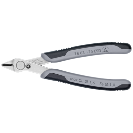 De KNIPEX Electronic Super Knips® ESD (78 03 125 ESD) is een hoogwaardige precisiezijkniptang voor uiterst fijn knipwerk in elektronica en fijnmechanica. Deze tang is uitgevoerd in een elektrisch afleidende – dissipatieve (ESD) variant, waardoor statische lading veilig wordt afgevoerd en gevoelige elektronische componenten worden beschermd.