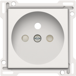 Centraalplaat voor inbouwstopcontact met penaarde en beschermingsafsluiters. Deze centraalplaat dient gebruikt te worden op een stopcontact met inbouwdiepte van 28,5mm. De afwerkingskleur is wit.