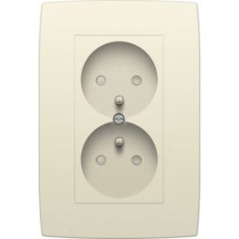 Dubbele inbouwstopcontact 16 A/250V met penaarde en beschermingsafsluiters. Volledig apparaat inclusief afdekplaat en voorgemonteerde afwerkingsset. Afwerkingskleur is Original Cream.