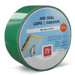 Luchtdichte tape 60 mm x 25 meter LDPE indoor groen is geschikt voor het luchtdicht afdichten van doorvoeringen en penetraties in dampremmende folies en PE-folie. Deze tape wordt voornamelijk gebruikt bij indoor toepassingen, zoals schuine daken, en is ideaal voor ronde doorvoeringen zoals buizen en kabels.