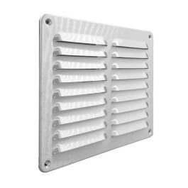 RVS 304 schoepenrooster met omgezette rand, opbouw, regeninslagvrij, voor toe- en afvoer van lucht. Verzonken bevestigingsgaten Ø 4 mm