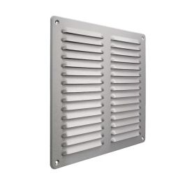 RVS 304 schoepenrooster met omgezette rand, opbouw, regeninslagvrij, voor toe- en afvoer van lucht. Verzonken bevestigingsgaten Ø 4 mm