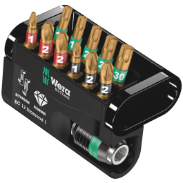 Bits met minuscule diamantdeeltjes op bitpunt. Deze zorgen voor een veilige grip op de schroef, verkleinen de vereiste aandrukkracht en reduceren het risico op wegglijden. BiTorsion-bits met torsiezone, waarin bij belastingspieken kinetische energie wordt afgeleid. Hierdoor wordt de levensduur van het product aanzienlijk hoger. Voorzien van Rapidaptor-technologie, om de bits te kunnen plaatsen zonder daartoe de huls te moeten bedienen. Om de bits weer te verwijderen, hoeft u de huls slechts naar voren te schuiven - zo kunt u bits zelfs met 1 hand razendsnel wisselen. Voor plaatsing in de schroefboormachine of in boorkop van een elektronisch geregelde boormachine. De meerdelige Bit-Check overtuigt door het lage gewicht en uitstekende compactheid. Daarbij zorgt het zachte materiaal in het onderste gedeelte van de Bit-Check voor een betere houvast voor de bits en maakt tegelijk het uitnemen daarvan makkelijker. Het profiel en het formaat van de bits zijn gemakkelijk te herkennen dankzij de Wera 'Take it easy'-Toolfinder met kleurcodering en duidelijk zichtbare beschrijving.