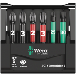 6 Wera Impaktor-bits, overzichtelijk en compact gerangschikt in handige Bit-Check. Bij de Impaktor-technologie wordt zo optimaal mogelijk gebruik gemaakt van de materiaaleigenschappen en is de geometrie volledig aangepast om langdurig gebruik mogelijk te maken, zelfs onder extreme werkomstandigheden. De bitpunt is voorzien van minuscuul kleine diamantdeeltjes die zorgen voor een hogere wrijvingsweerstand en zo het risico op wegglijden uit de schroef verkleinen.