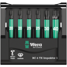 6 Wera Impaktor-bits, overzichtelijk en compact gerangschikt in handige Bit-Check. Bij de Impaktor-technologie wordt zo optimaal mogelijk gebruik gemaakt van de materiaaleigenschappen en is de geometrie volledig aangepast om langdurig gebruik mogelijk te maken, zelfs onder extreme werkomstandigheden. De bitpunt is voorzien van minuscuul kleine diamantdeeltjes die zorgen voor een hogere wrijvingsweerstand en zo het risico op wegglijden uit de schroef verkleinen.