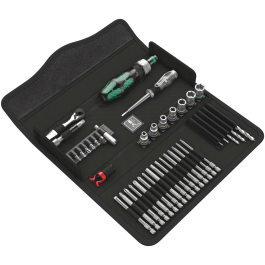 Compacte gereedschapsset met de 41 belangrijkste schroefgereedschappen voor houtconstructiewerkzaamheden; met de robuuste 1/4" bit-ratel Zyklop Mini met verlengstuk en dopadapter; 8 hand- en machinedoppen in de formaten 5,5-13; 1 ratel-handgreep 816 RA met ratelfunctie, fijne vertanding met kleine terughaalhoek, kartelwiel (rechts, vast, links), maximaal aanhaalmoment 50 Nm en bitopname met Rapidaptor-technologie; 1 universele bithouder; 6 bits, 25 mm lang; 16 bits, 89 mm lang; 5 houtspiraalboorbits met diameter 3-8 mm; 1 schroefklauw voor het vasthouden van schroeven; 1 eenpolige fasetester 247; stoffen etui met hoge robuustheid en lange levensduur; rechtop te plaatsen voor overzichtelijke opslag in gereedschapsrek; vanwege de stoffen buitenzijde ook probleemloos op kwetsbare oppervlakken te leggen; laag gewicht en gering volume en daardoor makkelijk mee te nemen.