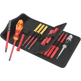 1 handhouder 817 VDE Kraftform, 12 VDE wisselklingen met "Take it easy tool finder": Met kleurcodering op profiel en ingelaserde maatcode - voor het eenvoudig en snel vinden van het benodigde gereedschap, 4 schakelkastsleutels, 1 een-polige fasetester. Individueel getest gereedschap conform IEC 60900. Individueel getest bij 10.000 V voor veilig werken bij de toegelaten spanning van 1.000 V. In robuust riemetui. Het stoffen etui is aan de achterzijde voorzien van een zacht gedeelte. Met behulp van de meegeleverde klittenbandstroken kan het stoffen etui aan de Wera 2go-componenten worden bevestigd. Of aan de muur, tegen een rek of werkplaatswagen.