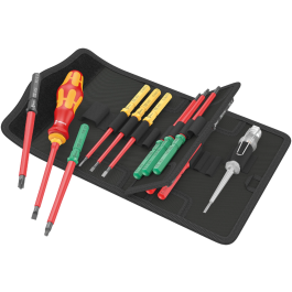 1 handhouder 817 VDE Kraftform, 14 VDE wisselklingen met "Take it easy tool finder": Met kleurcodering op profiel en ingelaserde maatcode - voor het eenvoudig en snel vinden van het benodigde gereedschap, 1 een-polige fasetester. Individueel getest gereedschap conform IEC 60900. Individueel getest bij 10.000 V voor veilig werken bij de toegelaten spanning van 1.000 V. In robuust riemetui. Het stoffen etui is aan de achterzijde voorzien van een zacht gedeelte. Met behulp van de meegeleverde klittenbandstroken kan het stoffen etui aan de Wera 2go-componenten worden bevestigd. Of aan de muur, tegen een rek of werkplaatswagen.