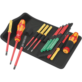 2 handhouder 817 VDE Kraftform en 15 VDE wisselklingen met "Take it easy tool finder": Met kleurcodering op profiel en ingelaserde maatcode; Kraftform Kompakt VDE 60 iS Take it easy 1x 0,6x3,5x157 met gereduceerde klingdiameter (iS), om ook diepliggende schroeven en veerelementen te kunnen bereiken en bewerken. Individueel getest gereedschap conform IEC 60900. Individueel getest in waterbad bij 10.000 V voor veilig werken bij de toegelaten spanning van 1.000 V. In robuust riemetui. Het stoffen etui is aan de achterzijde voorzien van een zacht gedeelte. Met behulp van de meegeleverde klittenbandstroken kan het stoffen etui aan de Wera 2go-componenten worden bevestigd. Of aan de muur, tegen een rek of werkplaatswagen.